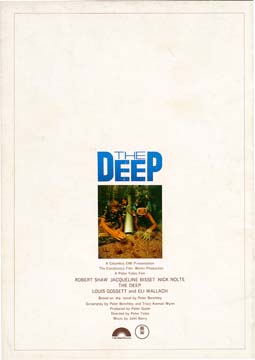 ■ストーリー ゲイル(ジャクリーン・ビセット)とデビット(ニック・ノルティ)はバミューダ島でバカンスを楽しんでいた。ある日スキューバダイビングを楽しんでいる二人は第2次大戦中に沈没した貨物船ゴライアス号を発見する、船の残骸に近づくとデビットは黄色い液体の入ったアンプルと珊瑚の付着した古いスペインの銀貨を発見する。 デビットは発見した銀貨をバミューダ島で沈没船に詳しいトリース(ロバート・ショウ)に調べてもたった、その帰りにデビットとゲイルは地元のギャング、クロージュ(ルー・ゴセット)らに襲われアンプルについて聞かれた。しらを切った二人は解放され、トリースに助けを相談する。トリースの調べによると沈没したゴライアス号には10万本のモルヒネのアンプルが積んであったらしく、クロージュらの狙いはモルヒネのアンプルらしい。 トリースはデビット・ゲイルの身の安全をクロージュと約束し変わりにアンプルの引き上げを請け負った、3人は1回目の潜水したときにゴライアス号の下から財宝を発見する、調べてみるとスペイン王フィリップスの財宝らしい、ゴライアス号に下に財宝を積んだスペインの船が沈んでいる。 アンプル引き上げと財宝探しを続ける3人、クロージュの威しをかわし宝探しを続ける3人、デビットはスペイン王の財宝である証拠の竜のペンダントを発見する、しかし発掘の途中にクロージュらによってけしかけられたサメとの格闘、発掘を中断し必死に船上にもとる3人クロージュとの安全の約束も不意になったトリースは、最後に竜のペンダントの回収とゴライアス号の爆破のために潜水する、クロージュも爆破の阻止とトリースたちを殺そうと潜水する。 全編の70%が海中映像のザ・ディープでは、撮影用に直径30m深さ10mの巨大プールを作りセットを沈めて撮影したほか、バミューダ、オーストラリアなのでロケを繰り返した。主演のジャクリーン・ビセット ニック・ノルティ、ロバート・ショウもダイビングのトレーニングからはじめ200回以上の潜水をした。 |