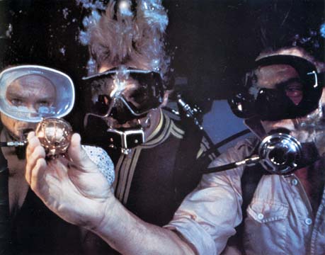 | ゲイル役の女優:ジャクリーンビセットの表情が見れるようにとクリアタイプのオーバルマスクや口元を邪魔しないようにマウスピースの小さいレギュレータ(スピンネーカー)使うなどスクーバ機材も配慮が伺えます。 | ||