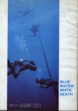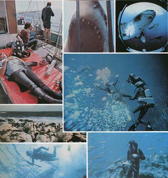 昔から人間に恐れられた魚サメの生態をカメラに納めるため、水中撮影の特別チームを編成、5か月にわたって南アフリカ、セイロン、オーストラリアと2万キロの旅を敢行した冒険記録映画です 監督・カメラマンのピーター・ギンベル探検隊長らはマダガスカル島・インド洋セイロン・オーストラリアの南岸と冒険を続けりる、ロン・テーラ、バレリー・テイラーなど有名なダイバーたちはギンベル考案なるアルミニュームの檻に入って、サメを待つ。巨大なホホジロザメは、エサにおびきよせられて、とうとう、その不気味な姿をあらわしたのだ。カメラをかまえるダイバーたちの目の前に5メートル、数トンに及ぶホホジロザメが、その恐ろしい歯を見せる。一匹また、一匹。中には、檻にかみついて、ものすごい音を立てるのもいる。スリル満点の撮影である。 |