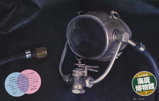 大正6年にアクアラングと同じ原理の潜水器が、日本で発明されていた。この大串式潜水器である。深海サルベージ作業などに活躍したものだ。ホースはマスクに接続され、口でレバーをかむと弁が開き空気がマスク内に流れ込むというしくみだ。潜水史の1ページを飾る発明だったといえよう。 (菅原久広)