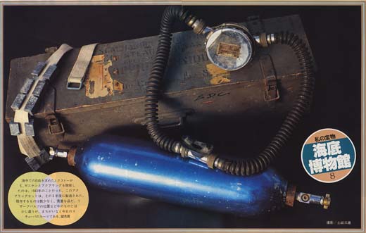 海底での自由を求めたJ.クストーがE.ガニヤンとアクアラングを開発したのは1943年のことだった。このアクアラングセットは、その5年後に清掃された。現存するものは数少なく、貴重な品だ。リザーブバルブの位置など今のものとは少し違うが、まちがいなく今日のスキューバのルーツである。(望月 昇)