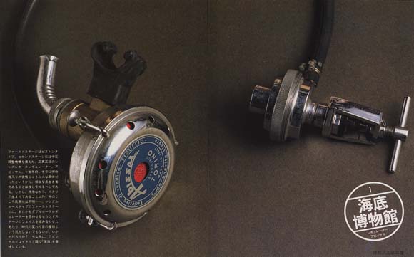 ファーストステージはピストンタイプ、セカンドステージには中圧調整機構を備えた、正真正銘のシングルホースレギュレター、アピッサル。十数年前、既に博物館入りの資格十分な風体だったから、相当な長生き者であることは推して知るべしである。しかし、残念ながら、イタリア生まれてあること以外、今のところ氏素性は不明・・・・・・シングルホースタイプのファイ-ストステージに、あたかもダブルホースレギュレターを思わせるセカンドステージのフェイスをくみあわせたたたり、時代の変わり目の産物という気がしないでもないが、いかがだろうか?ちなみに、アピッサルとはイタリア語で「深海」を意味している。。 |