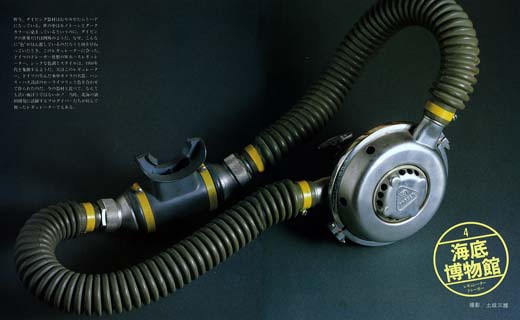 昨今、ダイビング機材はむやみやたらとハデになっている。世の中はモノトーンとダークカラーに染まっているというのみ、ダイビングの世界だけは例外のようだ。なぜ、こんなに”色”がはん濫しているのだろうと頭をひねっていたとき、このレギュレターに出会った。ドイツのドレーガー社製のダブルホースレギュレター。シックな色調とスタイルは1950年代を象徴するようだ。実はこのレギュレター、ドイツの生んだ水中カメラの名器、ハンス・ハス設計のローライマリンと色をあわせて作られたのだ。今の機材にくらべて、なんとも渋い風貌ではないか!当時、北海の油田開発に活躍するプロダイバーたちが好んで使ったレギュレターでもある。 |