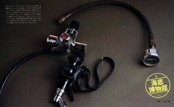 左のレギュレターは、スペインのネムロード社製、金属製のレギュレターが全盛だった今から10年以上も前に、プラスチックを使って作られたもの、最近では、USダイバーズ社のロイヤルアクアラングをはじめ、プラスチック製のレギュラターも登場しているが、当時としてはみずらしかったにちがいない。右のゲージは、ポンプメーカが作った潜水用の残圧計の初期のものだ。中圧ホースに書かれた「ヤマダのポンプ」という文字が、ダイビング機材になんとも不釣り合いでおもしろい。。