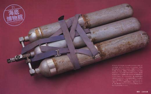 ダブルタンクにさえめったにお目にかかれない今日このごろである。ましてトリプルタンクともなれば、その存在すらしらなくてもあたりまえだ。写真のトリプルタンクに関して言えば、米軍払い下げの高圧ボンベを3本組み合わせて、バルブを取り付けた手造りもの。救命用のおおかがゴムボートを瞬時に膨らませるための軍用高圧ボンベというから、ボンベそのものは、第二次世界大戦中に作られたものだろう。それが千号の闇市にでも出回り、スクーバ用の高圧ボンベを探していた人の目にとまったに違いない。こうした機材を見ると、混乱の中にあっても、常に夢を描いてチャレンジしていた”時代のぱわー”のようなものを感じてしまう。 |