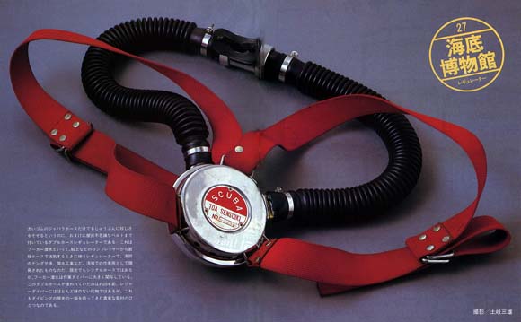 太いゴムのジャバラホースだけでもじゅうぶんに珍しさをそそるというのに、おまけに摩訶不思議なベルトまで付いているダブルホースレギュレターである。これはフーカー潜水といって、船上などのコンプレッサーから直接ホースで送気する時に使うレギュレターで、漁師のてんぐさ漁、潜水高次など、浅場での作業として開発されたものなのだ。現在でもシングルホースではあるが、フーカ潜水は作業ダイバーに大きく関与している。このダブルホースが使われていたのは約20年前、これもダイビングの歴史の一端を担ってきた貴重な機材のひとつなのである。。 |