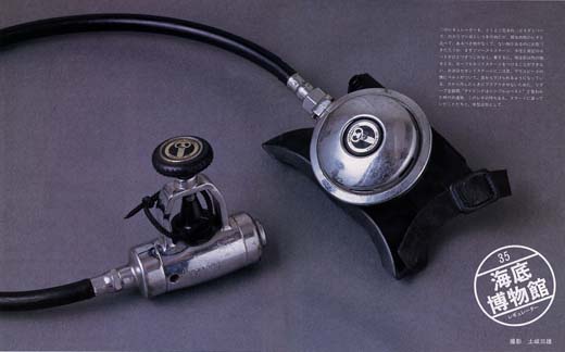 このレギュレターを、とくとご覧あれ。U.S.ダイバーズのカリプソVという年代物だが、現在市販のレギュレターと比べて、あるべき物がなくて、ない物ががあるのにお気づきだろうか。まずファーストステージ。中圧と高圧のホースがひとつづつしかなく、要するに、残圧計以外の物、BCD、セーフセカンドステージをつけることができない。お次はセカンドステージにご注目。マウスビースの横にベルトがついていて、首から下げられるようになっている。口から外したときにブラブラさせないためだ。リザーブ全盛期、”ダイビングはシンプルisベスト”と言われていた時代の遺物。このレギュの持ち主も、スマートに潜っていただろう、体型は別として。 |