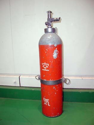当時、朝鮮戦争、ベトナム戦争に出撃するアメリカ軍の中継基地となった日本には、多くの軍需物資が這いいてきた、戦闘機には二酸化炭素を充てんした消火器やパイロット用の酸素ボンベなど多くのタンクが塔載された、その放出品をスクーバ用タンクに改造したそうです。当時は国産のタンクも有ったのですが高価でした、そこで戦闘機に塔載するタンクの放出品に目をつけたのです。戦闘機用とあって軽くてスクーバ用に向いていることもあり、自製のバブルを作りつけて改造をしたそうです。