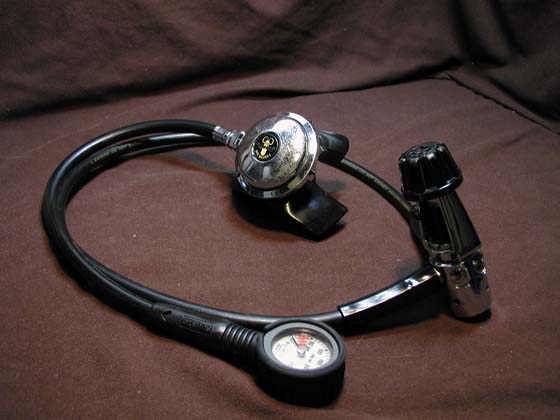「ベーシックスタイルのレギュラターが欲しい」そう思ったのは90年代に入ってからだった。小型・軽量化おしゃれでカラフルなレギュレターが増えるなか、なぜかこのシンプルなレギュレターに魅力を感じた。1stステージはバランスドピストン、メタルの2ndステージは初代カリプソを思わせるアクアラング社の基本的形、海上保安庁など職業ダイバーまみなこのタイプのレギュレターを使っているそうで「個人でこレギュレターを選ぶひとはいませんよ」と言われながらも購入した。オーバーホールを繰り返し今も主力器であるオクトパスや中圧ホースも付くが私は残圧計のみのシンプルで使うのが好きでこの組み合わせのままである。