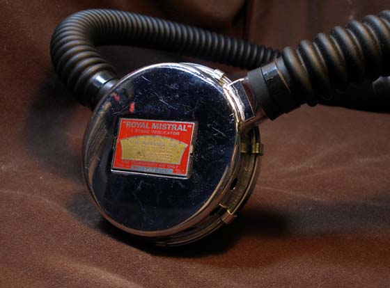 ROYAL-MISTRALは U.S.Diversから発売されたミストラルの限定機種です。1965年〜1958年の3年間に製造され赤の名盤をつけていることから「赤ラベル」と読んでいます。 U.S.Diversのトレードマークの王冠を形とったネームレベルに使うなどAqualangグループのシンボル的なレギュレターです。MISTRALは1段減圧方式(タンクの高圧から一気に呼吸圧まで落とす方式)です、1段減圧は制御部分の部品数が少なく補修が簡単です。ただしタンク圧の低下による呼吸抵抗の発生や高圧部も150kg/cm2までの限定などがあります。
