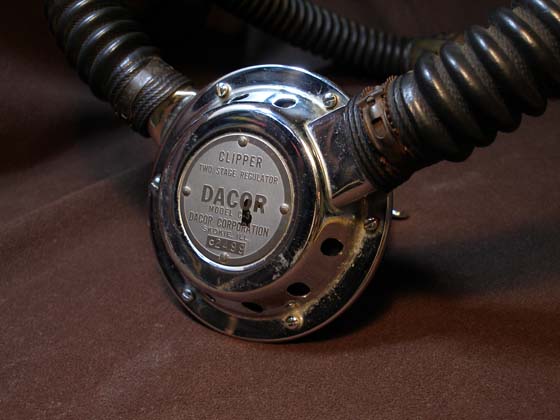 DACOR社製のダブルホースレギュレターである。2段減圧方式(1次:バランスダイアフラム・2次:ダウンストリーム)を採用している。方式は基本的であるが実装がオリジナリティー溢れる実装方法である、狂いが少なく安定稼動する為の工夫やエアーの供給をいかにスムースにするか、創意工夫の塊である。日本には輸された台数が少なく修理部品がほとんど手に入らない。40年以上経った今でも部品に錆びはなくがたつきなど無いクルーニングにより機能を取り戻すであろう。