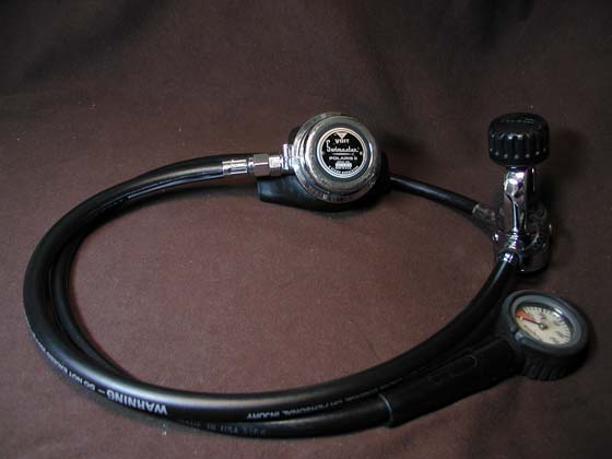 AMF VOIT社のシングルホースレギュレター R-14 POLARISUです、60'後半に製造されたレギュレータです。1st伝ー字はスタンダードピストン、しかし私の手者にきたときには中圧が取れなく修理不能の為Maresの1stステージにつなげてあります。 2ndステージも瀕死の状態でした。何とか救いたいとお願いして、側とデマンドバルブの一部を残し内部はすべて別のレギュレータから部品を投入しました。 フェイスしていますな内部は全て新品のレギュレターです。