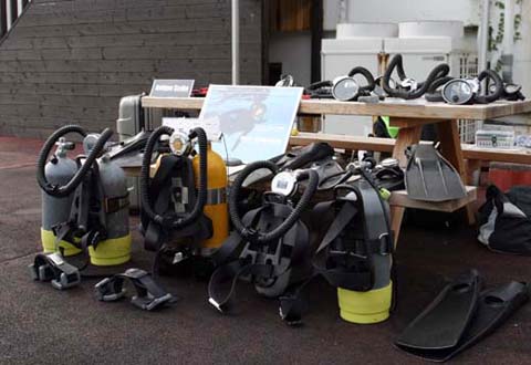 | その頃使われていたスクーバダイビング器材が今、手元にあるのです、しかも使える状態で! 40年前のスクーバ器材がなぜか お洒落で、カッコ良くみえてきませんか? |