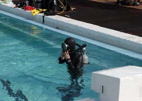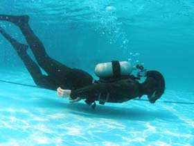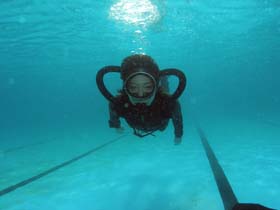 | ダブルホースレギュレータです、1943年にJ.Y.クストーによって発明されてからしばらくはレギュレータと言えばダブルホースレギュレータでした。AQUALANG(株)社のトレイードマークもダブルホースレギュレータを形とったものでした。ダブルホースレギュレータは中央にある直径15cm厚み5cmほどの金属部分をタンクに接続します。この金属の箱の中に1stステージと2ndステージが入っていて空気を調整しています。ダイバーがマウスピースで呼吸すると右側のホースを通って空気が吸えます、吐き出した空気は左側のホースを通ってレギュレータに戻りダイバーの背中の位置で水中へ放出されます、ダイバーの正面には泡が出ないのです。ダブルホースレギュレータは水深にあわせた圧力の空気を作るダイアフラムがダイバーの背中の位置にあります、その為泳いでいるダイバーは常にレギュレータの位置と肺の位置の差からなる圧力差をうけて呼吸するのです、苦しくはありませんが意識して吸わないと吸えません。また残圧計を付けるポートが無くタンクに「Jバルブ」を付け30圧を残した時点で空気が渋くなりリザーブバルブを開けて浮上していました。1980年代に入ると扱いにくいダブルホースレギュレータに代わってシングルホースレギュレターが人気となりダブルホースレギュレータは姿をけしてしまいました。 |